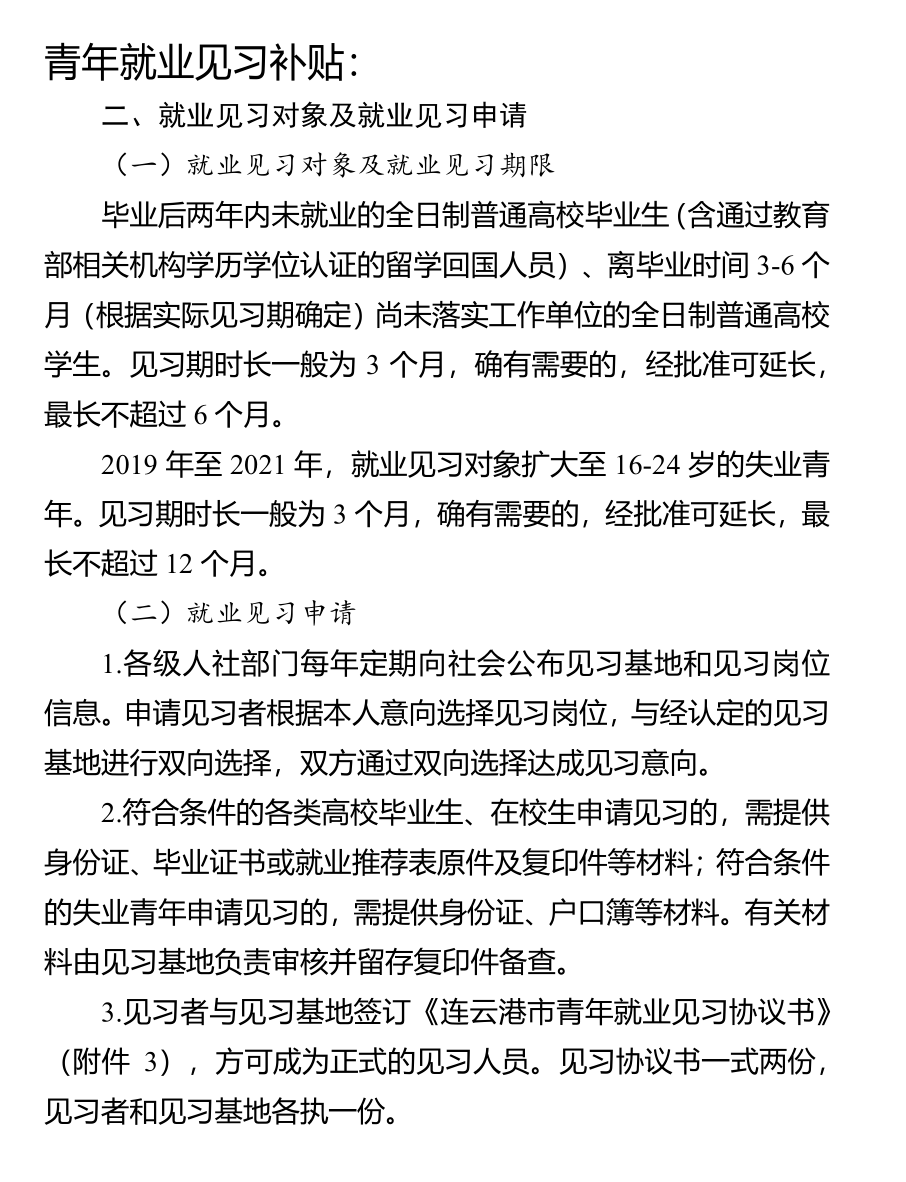 | 文件名称和文号 | 连人社〔2020〕97号、连财社〔2020〕65号 关于印发《连云港市青年就业见习实施办法》的通知 |