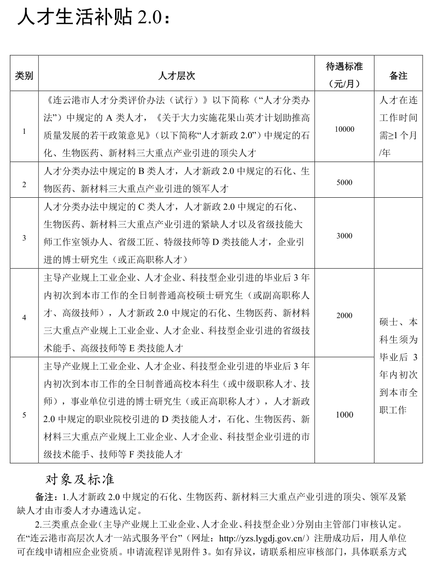 | 政策实施范围 | 2022年1月1日及之后(以参保时间为准)引进到我市市区工作的,且符合《关于开展连云港市市区人才生活补贴申报工作的通知》中规定的生活补贴发放对象标准的各类人才。 |