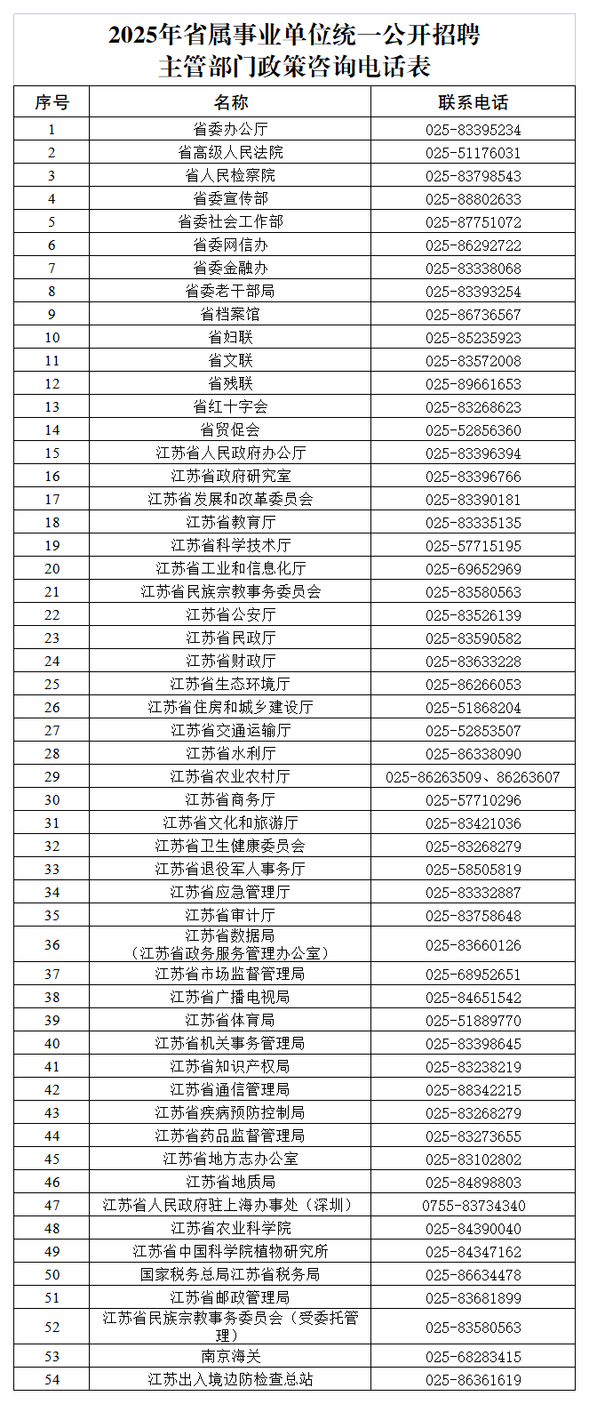 2025年省属事业单位统一公开招聘主管部门政策咨询电话表